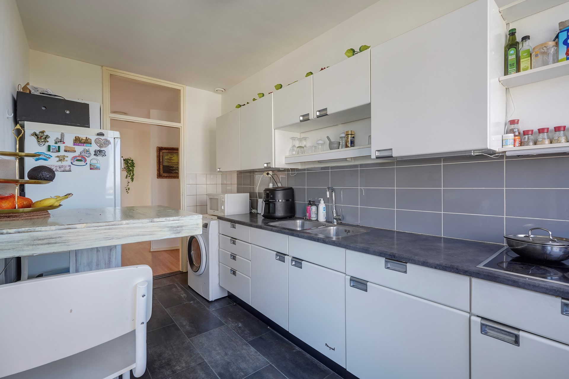 Via de afgesloten centrale hal kom je via het trappenhuis of met de lift bij de voordeur van het appartement. Bij binnenkomst van de woning sta je in de hal met aan de linkerkant een slaapkamer en de keuken met directe toegang tot het balkon aan de voorzijde. De keuken is voorzien van een 4-pits inductiekookplaat, een koelvriescombinatie en voldoende opbergruimte voor servies en kookgerei. Ook is er een wasmachine aansluiting aanwezig.