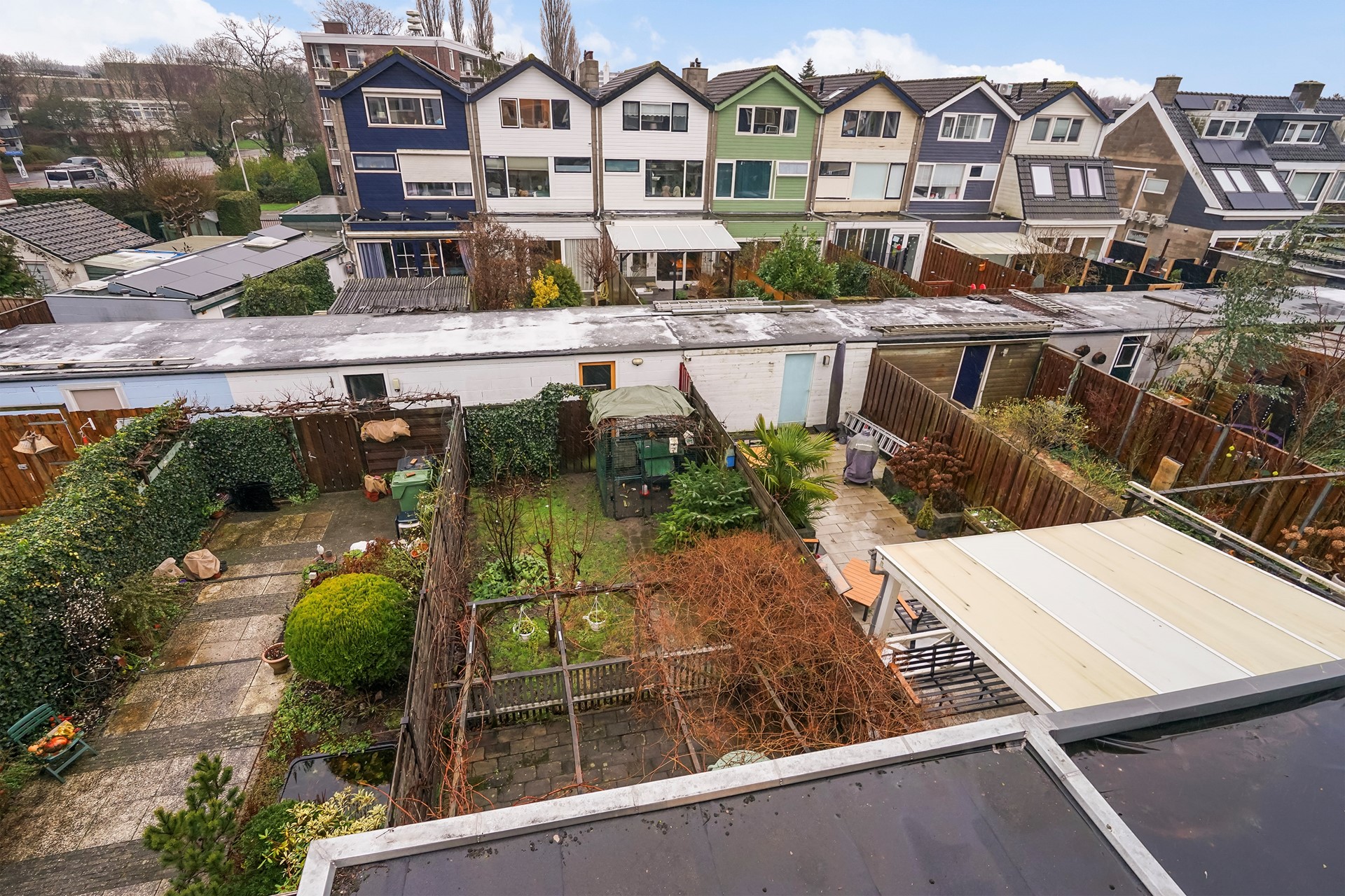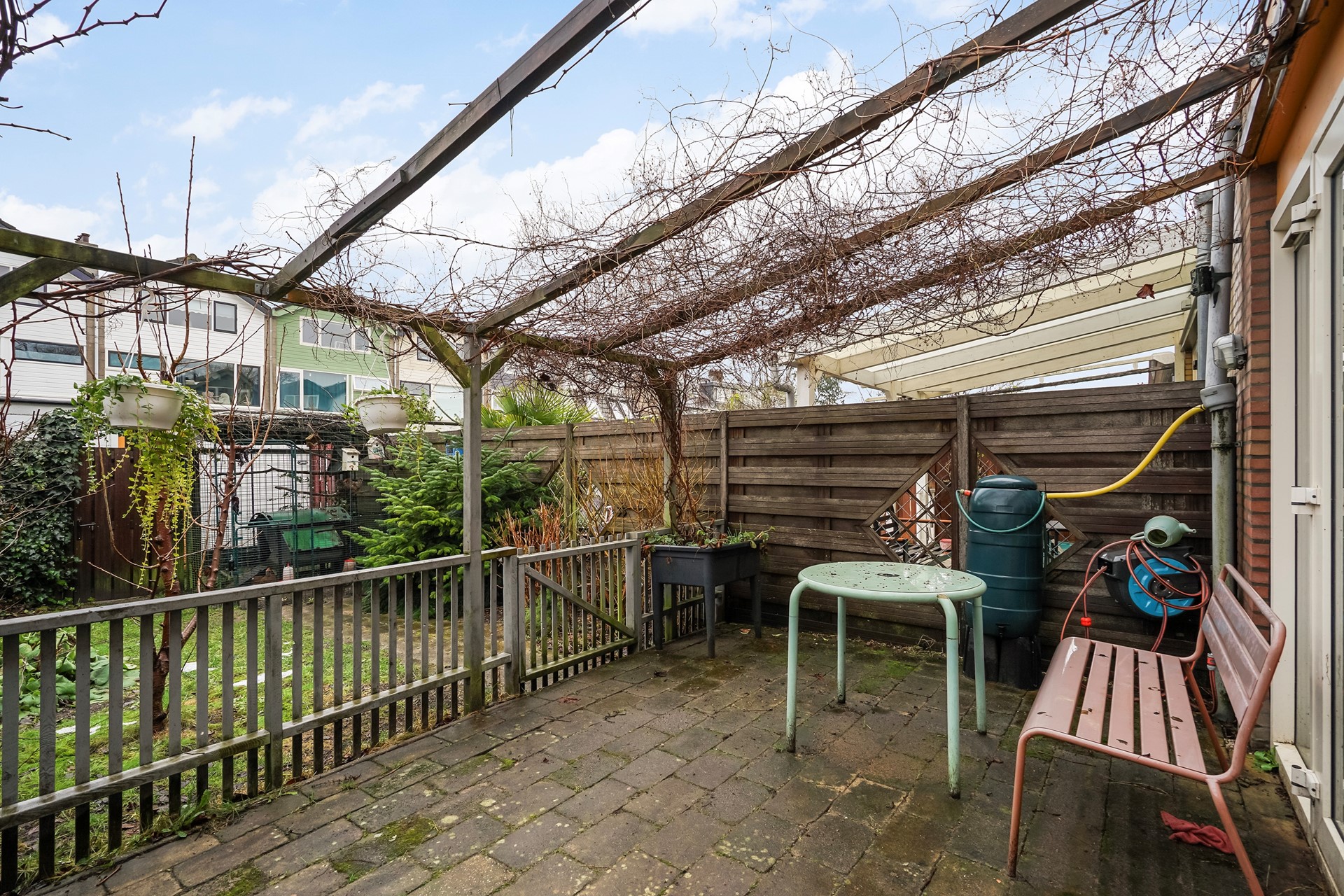 Through the French doors you access the back garden, which includes a storage shed and a rear entrance. In the garden there is a chicken coop with five chickens. As the seller cannot take them to the new home, they can be taken over upon purchase of the property.